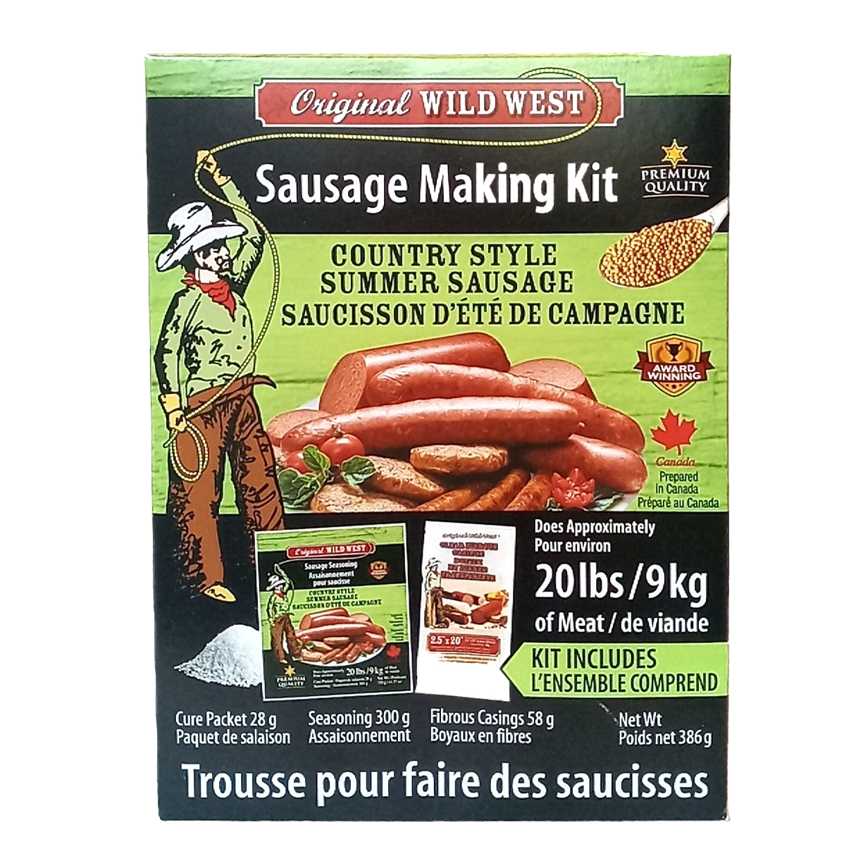 - Kit contains 300 grams of seasoning, a 28 g cure packet, and seven 2.5"x 20" fibrous casings