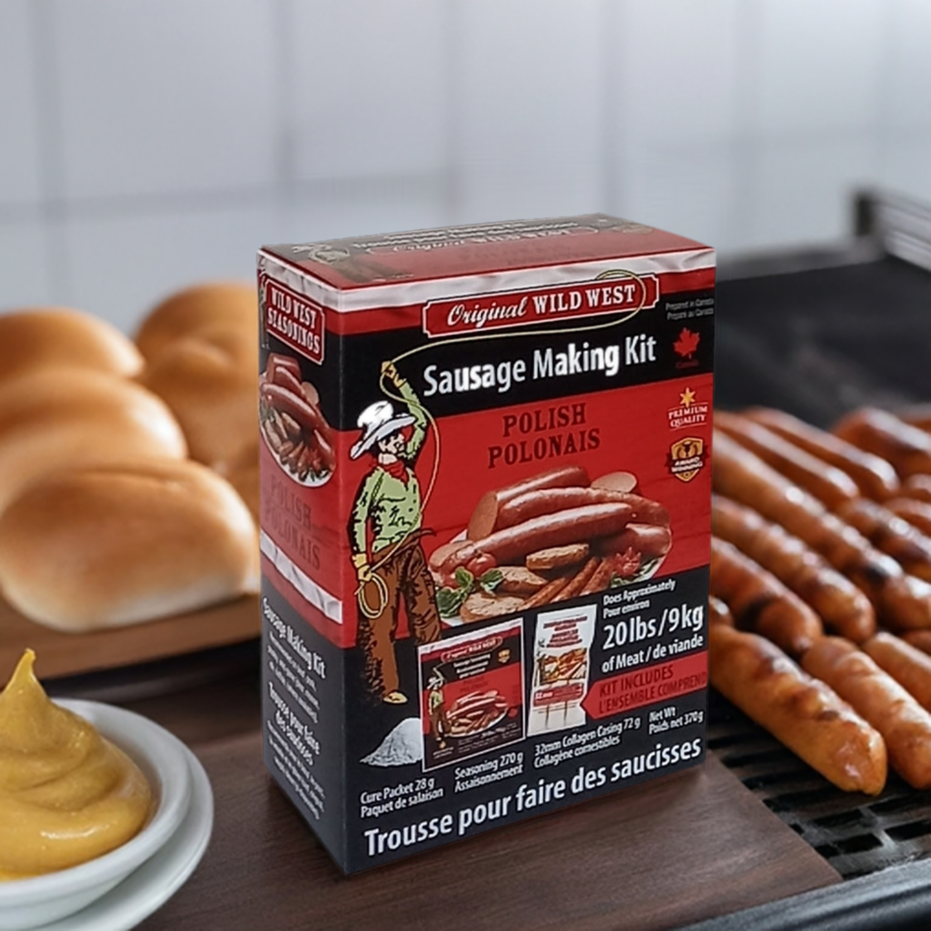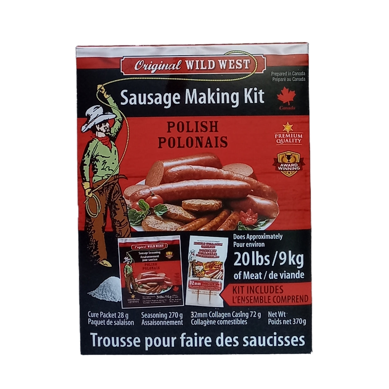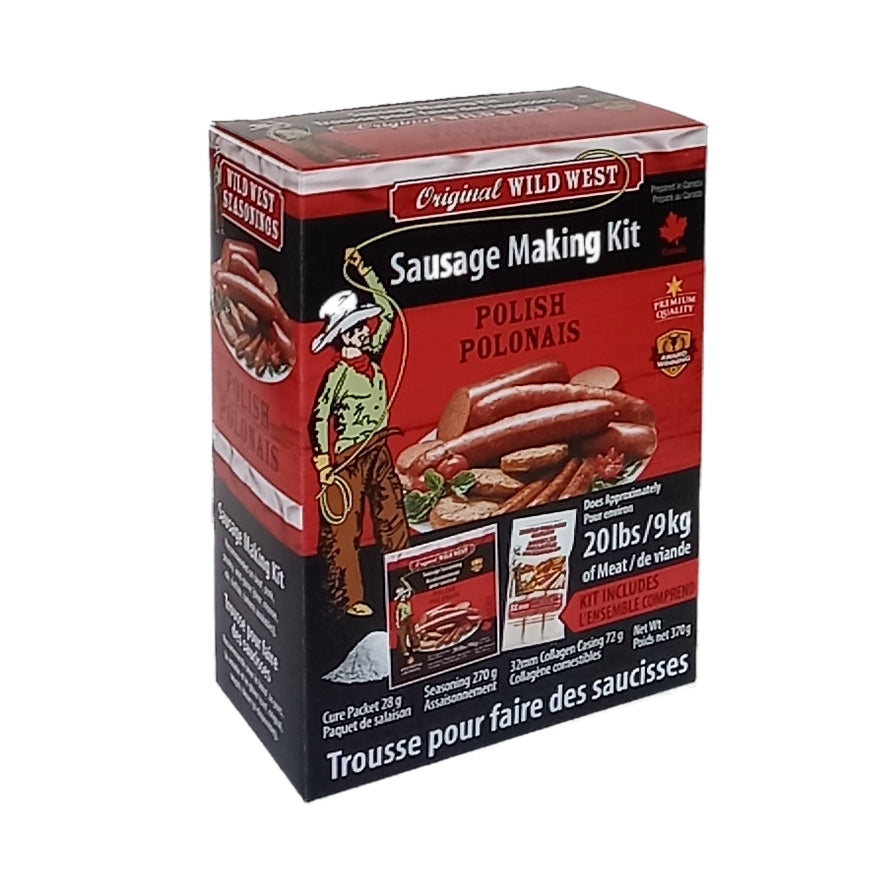- Kit contains 270 grams of seasoning, 28 gram cure package and 3 strands of 32 mm collagen casings
